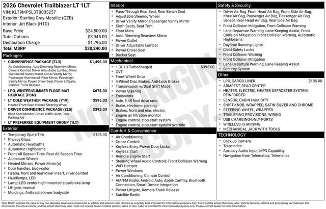 Sterling Gray Metallic 2026 Chevrolet TrailBlazer LT FWD CVT 1.3L I3 Turbocharged DOHC 12V LEV3-SULEV30 137hp